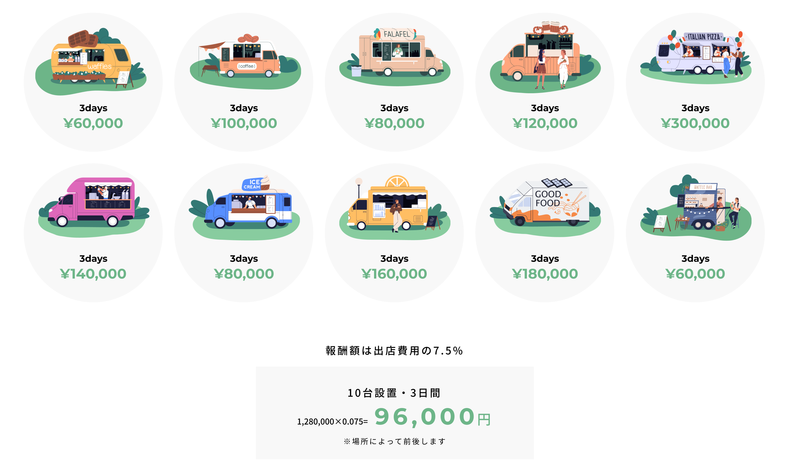 キッチンカーの売上から一定割合を出店料として還元。初期費用や固定費は一切発生せず、リスクなく始められます。